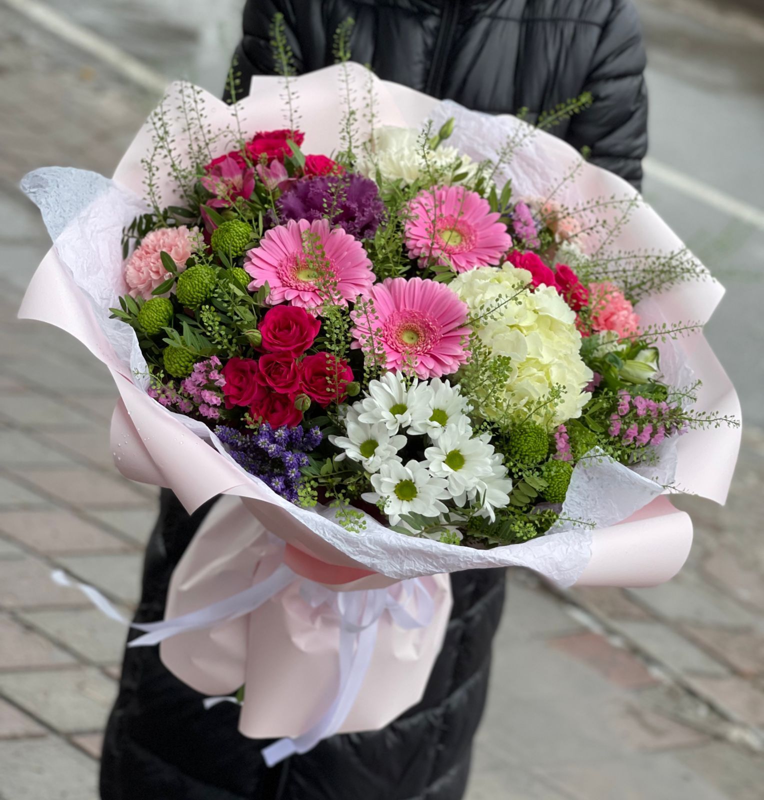 3. Состав: Гербера, гортензия , хризантема одноголовая, хризантема кустовая , роза кустовая ,тласпи, лист фисташки, статица , альстромерия , вероника, гвоздика, брассика